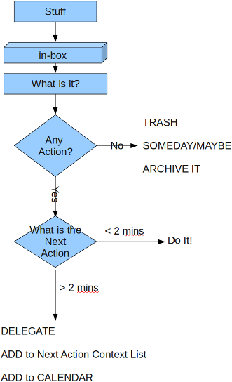 - If there is an action, you should do it immediately (if it takes less than 2 minutes to do it), or delegate it to somebody, or defer it for later by putting it in the appropriate next action context list (more on that below).